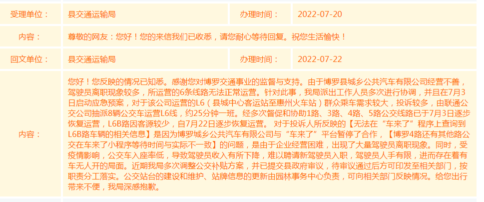 网友在博罗县政府网站的网络问政平台上反映,4号公交车线路无法查询到站时间,且车辆稀少,常常需要等待40多分钟才能等来一辆车。博罗县交通运输局解释称,自2020年中央取消新能源运营补贴以来,加之新冠肺炎疫情影响以及高铁、网约车等交通工具的快速发展,公交企业陷入亏损困境。博罗县城乡公共汽车有限公司因资金周转不畅,驾驶员收入下降,难以招聘新驾驶员,导致现有驾驶员人手不足,部分公交车无法正常运行。
