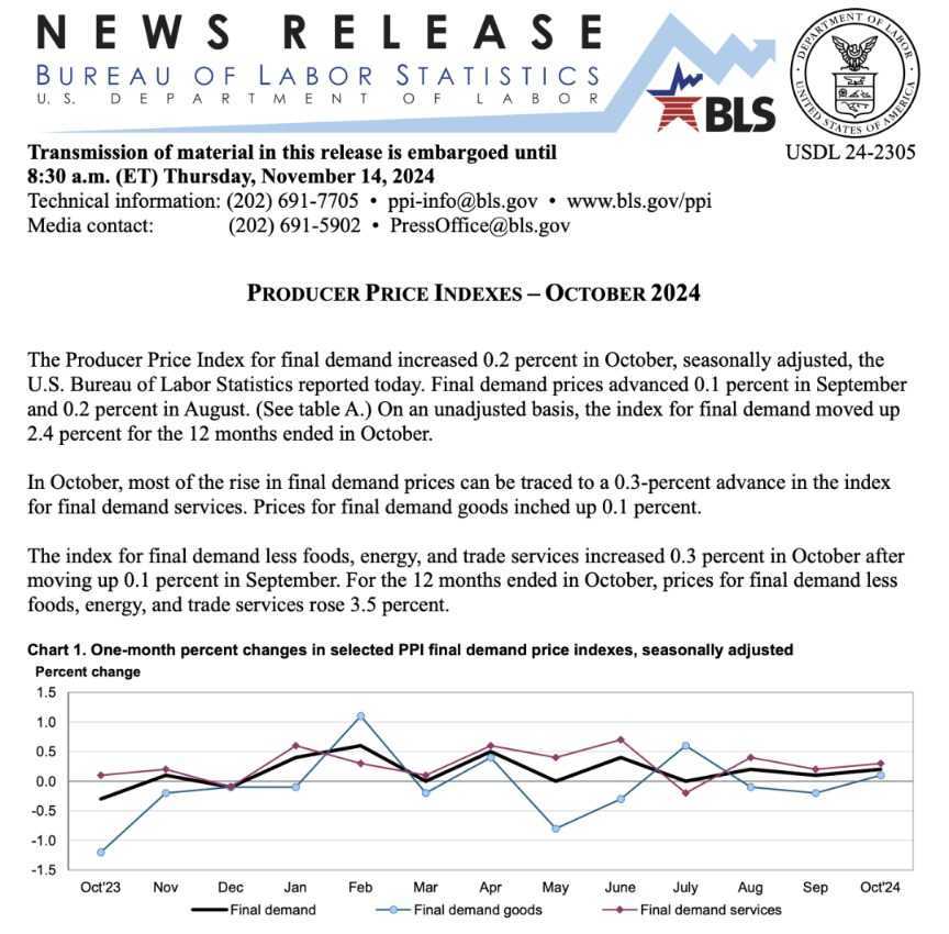 比特币短线急跌,引发市场广泛关注。当地时间11月14日,美股三大指数集体收跌,纳指、标普500指数和道指均出现下跌。经济数据方面,美国10月PPI同比上升2.4%,超出市场预期,同时PPI环比也上升0.2%。受此影响,市场对12月降息的预期大幅提升至80%以上。