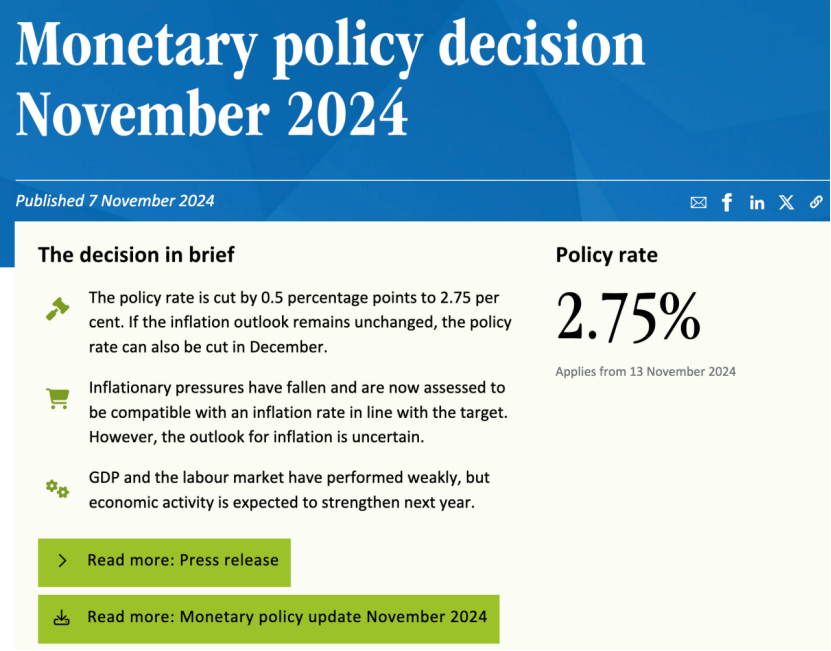 欧洲“降息潮”正在席卷全球金融市场。11月7日,瑞典央行宣布降息50个基点,将基准利率从3.25%下调至2.75%,这是该央行近十年来最大的一次降息行动。瑞典央行表示,由于通胀下降和经济活动持续疲软,未来可能会在12月以及2025年上半年再次下调政策利率。