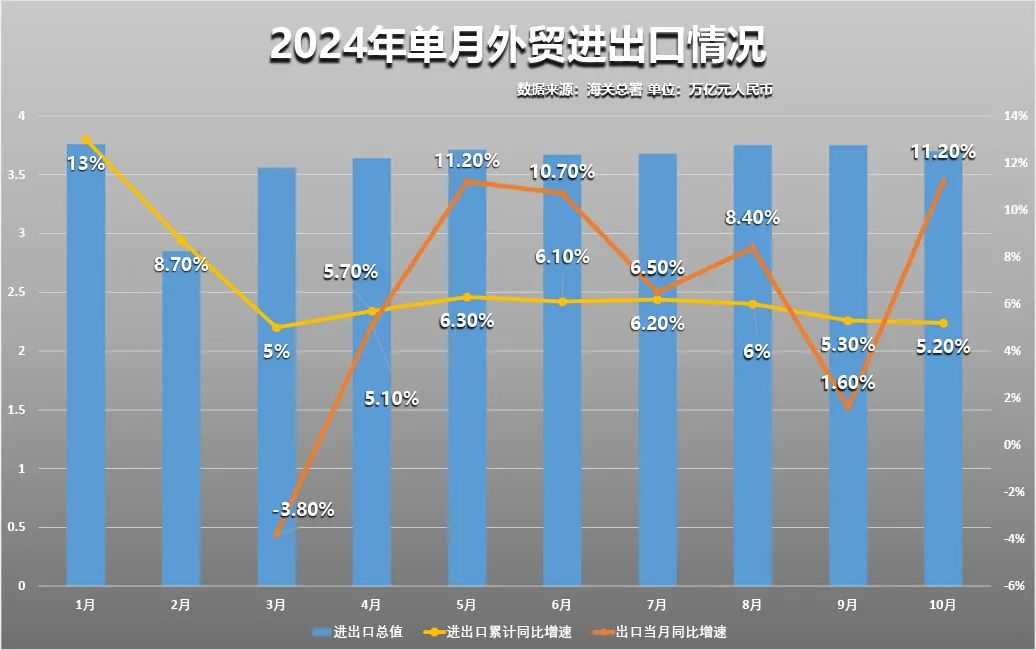 从10月单月来看,进出口总值达到3.7万亿元,同比增长4.6%。其中,出口额高达2.19万亿元,同比增长11.2%,远超市场预期;进口额为1.51万亿元,同比减少3.7%。