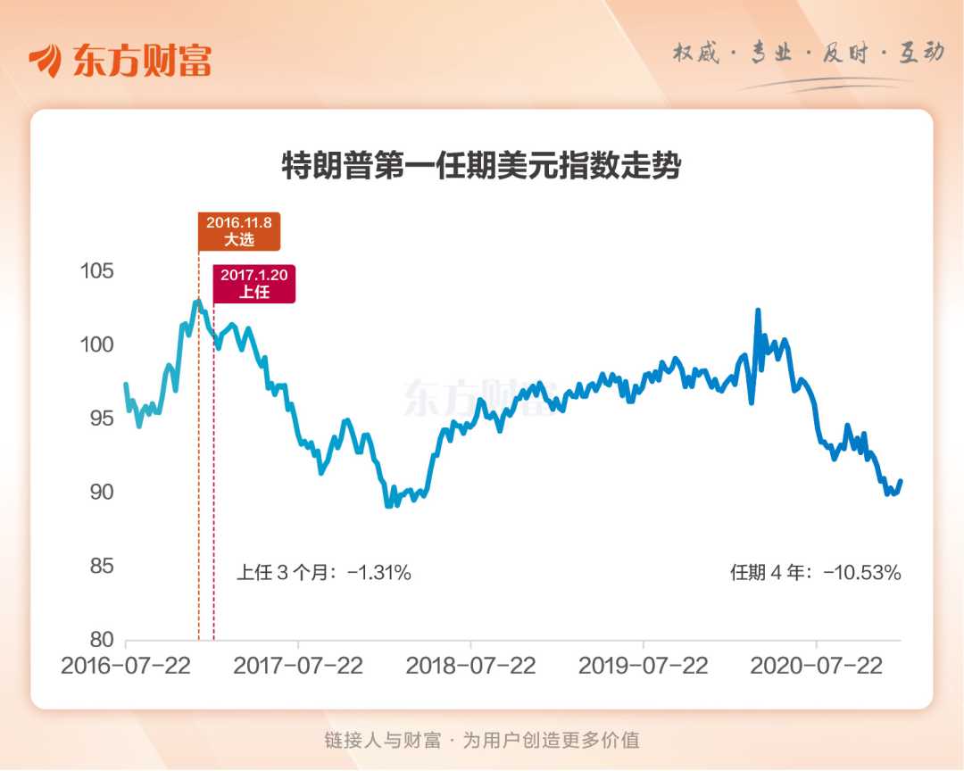 从2017年1月至2021年1月,特朗普的首个任期内,美元表现相对疲弱。上任初期三个月,美元指数便下跌了1.31%,整个任期四年间更是下跌了10.53%。