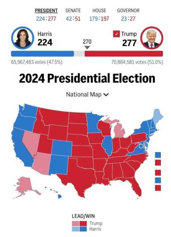 根据多家美国主流媒体最新公布的初步测算结果显示,特朗普目前已成功获得277张选举人票,这一数字已经超过了胜选所需的270张选举人票,从而提前锁定了胜局。相比之下,哈里斯的得票数则暂时停留在224张。