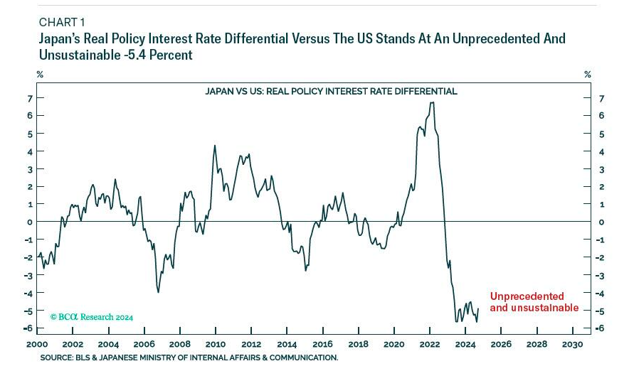 目前,日本虽已摆脱负利率,但实际政策利率(名义利率-通胀率)仍高达-2.3%,日美两国实际政策利率差更达到了极端的-5.4%。自2022年以来,日本相对于美国的实际政策利率差已显著变化了-12个百分点,这种前所未有的转变,令人担忧。