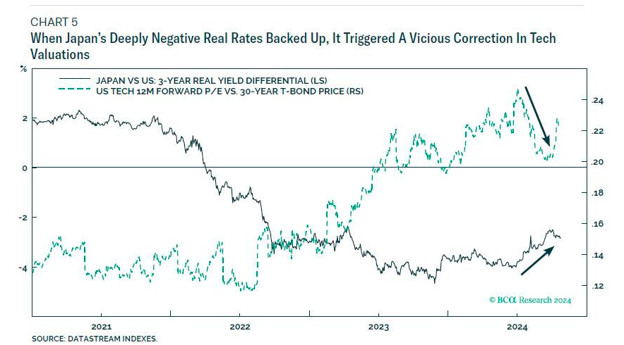 今年7月底和8月初,当日本负实际利率大幅回升时,科技股估值出现了恶性调整,进一步证实了Joshi的观点。他认为,这主要源于日本央行退出零利率政策的预期及美联储激进降息预期的结合,导致日本相对于美国的实际利率急剧上升。