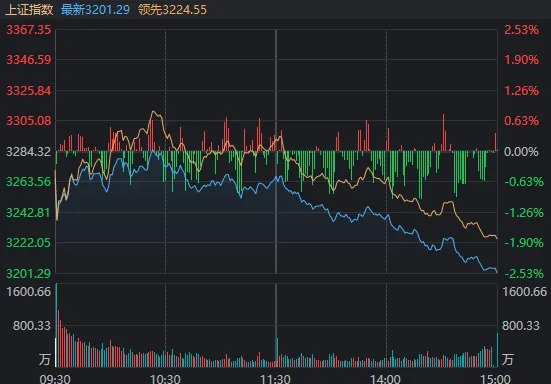 10月15日,A股市场遭遇全天震荡下挫,创业板指领跌,收盘时沪指、深成指及创业板指分别下跌2.53%、2.53%和3.22%。