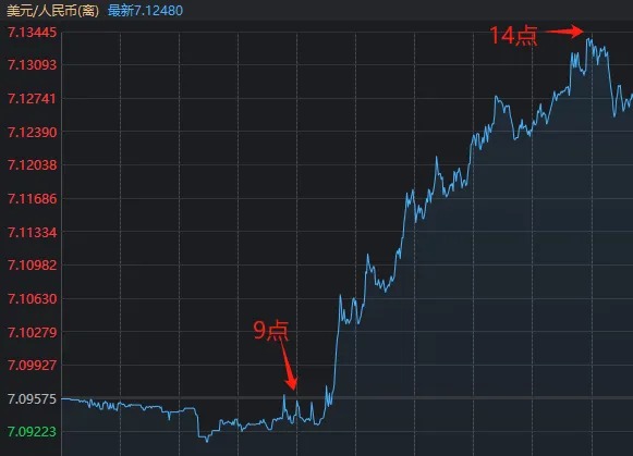 值得注意的是,A股交易时段内,人民币汇率出现明显贬值,成为市场最大的变数。约13:48时,离岸人民币兑美元日内跌超350点,报7.1316,直至14点左右才有所回升。