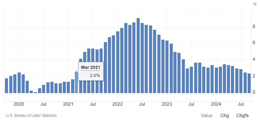 美国劳工统计局详细数据显示,今年9月,美国消费者价格指数(CPI)环比增长0.2%,同比增长2.4%,均高出市场预期0.1个百分点,市场原本预期同比增幅能从2.5%下降至2.3%。尽管如此,2.4%的同比增速已是自2021年3月以来的最低水平。
