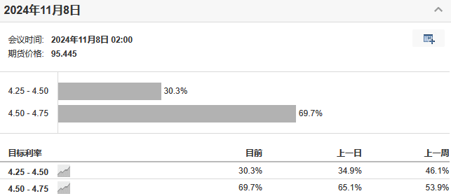 美联储利率观测工具最新数据显示,11月降息25个基点的概率升至69.7%,降息50个基点的概率则从46.1%降至30.3%。尽管市场对“美联储将再次大幅降息50个基点”的预期受到冲击,但仍有人认为,美联储一次降息50个基点的大门并未完全关闭。例如,亚特兰大联储主席博斯蒂克表示,若美国劳动力市场疲软,他对再次降息50个基点持开放态度。