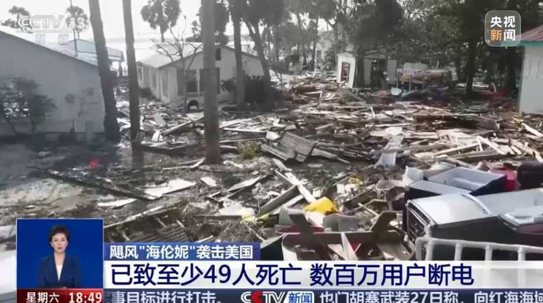 飓风“海伦妮”在美国佛罗里达州登陆后北上,造成美国东南部多州至少49人死亡,大量房屋被毁,460多万用户断电,多地宣布进入紧急状态。