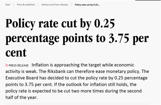 瑞典央行在声明中表示,由于货币政策和供应冲击减弱导致通胀下降,目前已接近2%目标,因此可以放松货币政策。此举为受衰退困扰的瑞典经济提供支持。