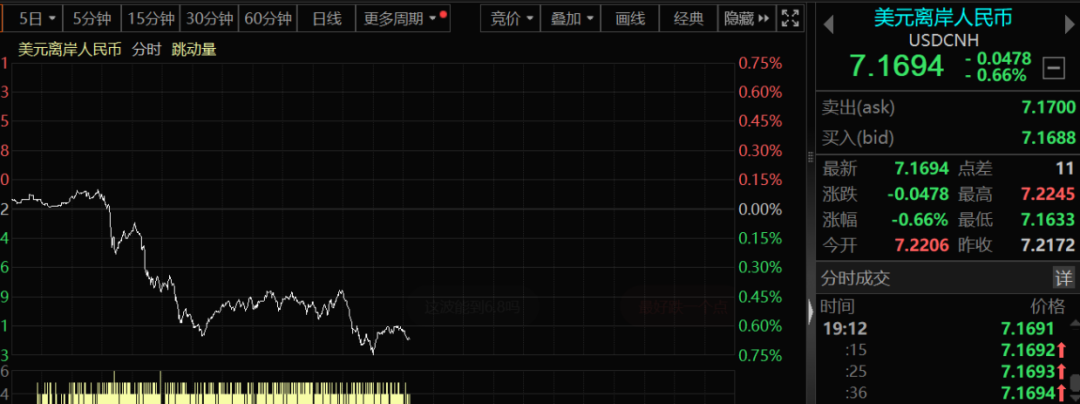 周一下午5点30分左右,在岸人民币和离岸人民币对美元汇率持续攀升,分别突破7.17关口,日内涨幅分别达到800个基点和500个基点。与此同时,美元指数虽有所下跌,但与人民币的强劲涨幅相比,其跌幅并不显著。