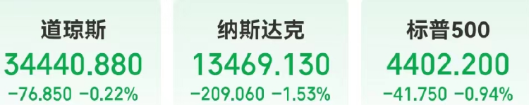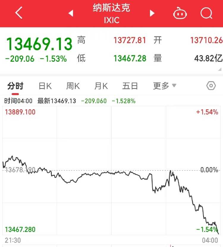 美联储主席鲍威尔在讲话中并未安抚市场,他表示美联储准备在适当的情况下进一步加息,尽管他强调将会“谨慎行事”。鲍威尔的讲话导致美股尾盘一路震荡走低,截至北京时间9月21日05:00,美股三大指数集体收跌,其中纳指下跌209点,跌幅达1.53%,标普500指数跌0.94%,道指跌0.22%。大型科技股也普遍下跌,谷歌跌超3%,奈飞、微软、英伟达、苹果等跌逾2%,亚马逊、Meta、特斯拉跌超1%。