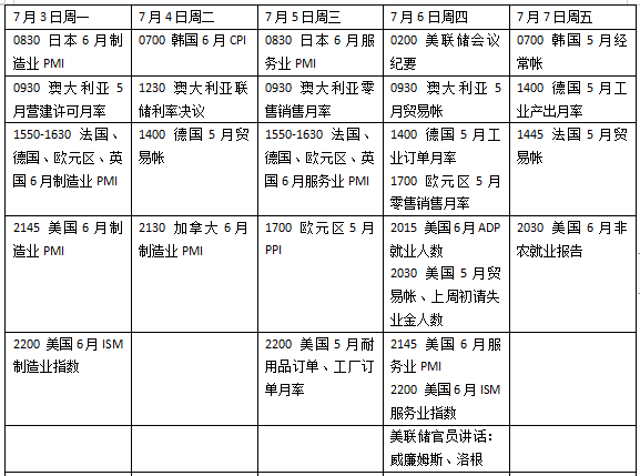本周,全球金融市场将迎来多个重要事件。美国6月非农就业报告备受瞩目,或将成为本月美联储议息会议的风向标。此外,ISM制造业和非制造业指数的表现也将对外界对利率的预期产生重要影响,市场将密切关注美联储会议纪要中有关维持利率不变的内容。同时,澳大利亚联储也将召开议息会议,市场预计其将继续紧缩步伐。