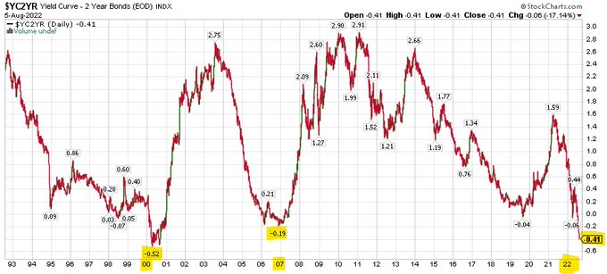 数据显示,7月份新增非农就业人数达到了52.8万人,几乎是市场预期的两倍有余,失业率也超预期下降至3.5%,追平50年低点。然而,在数据公布后,美债市场反映未来经济衰退风险的前瞻指标——2/10年期美债收益率曲线的倒挂程度却进一步加深,两者间的倒挂幅度已超过40个基点,创2000年以来之最。