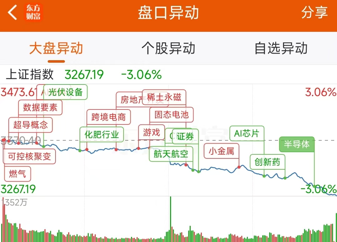 11月22日,A股市场午后呈现单边下行趋势,市场情绪低迷。截至收盘,上证指数大幅下跌3.06%,报收于3267.19点;深证成指同样走低,跌幅达到3.52%,收盘报10438.72点;创业板指更是重挫3.99%,收盘点位为2175.57点。在行业板块方面,呈现出普跌态势,其中光伏设备、生物制品、多元金融等板块跌幅居前,市场承压明显。