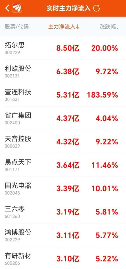从主力资金流动情况来看,周五造纸印刷、贸易行业等板块资金净流入明显,其中造纸印刷板块净流入达到5.93亿元。在个股方面,拓尔思凭借8.50亿元的主力净买入金额位居榜首,并成功实现20CM涨停;利欧股份紧随其后,主力净买入6.38亿元。
