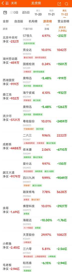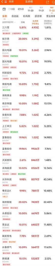 在龙虎榜方面,三六零以4.93亿元的资金净流入位居榜首,该股日内一度涨停,收盘大涨5.81%,成交额达到137.46亿元,换手率高达14%。从游资角度看,上海超短帮净买入5.25亿元,其中净买入三六零4.02亿元。相反,毛老板则净卖出2.94亿元,其中净卖出和而泰2.94亿元。