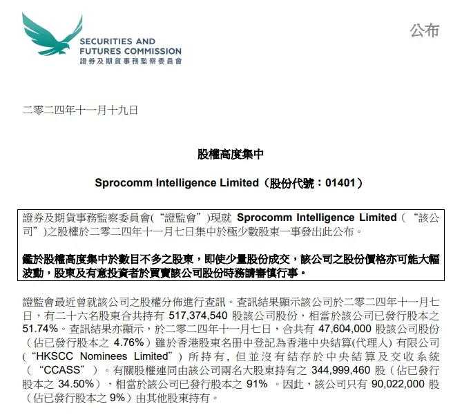 与此同时,港股市场则出现剧烈波动。港股上市公司SPROCOMM INTEL(01401.HK)股价今日早盘一度暴跌超过90%,截至收盘下跌87.96%。此前,该公司股价曾在今年内大幅上涨396%。香港证监会发布公告称,SPROCOMM INTEL股权高度集中,提醒股东和潜在投资者谨慎交易。