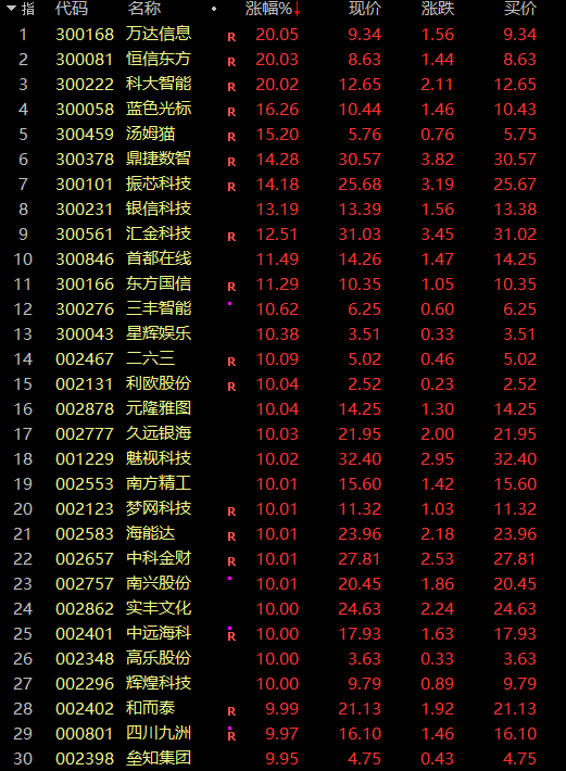 在热点方面,人工智能概念全线大涨,板块指数放量上攻,涨幅超过3%。板块内个股掀起涨停潮,万达信息、恒信东方、科大智能等个股20%涨停,二六三、中科金财、利欧股份、实丰文化等超过30只个股涨停或涨幅超过10%。