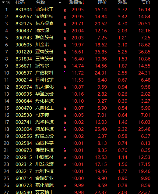 化工股今日也整体大涨,迪尔化工、汉维科技等个股30%涨停,清水源、联创股份、川金诺等个股20cm封板,川发龙蟒、嘉化能源、三维化学等超过30只个股涨停或涨幅超过10%。