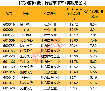 此外,上述63家公司中,属于央国企的公司数量占比超过八成,整体股息率保持较高水平。近12个月股息率超过5%的公司有13家,主要分布在银行、纺织服饰及交通运输行业。民生银行、平安银行股息率超过8%,雅戈尔、大秦铁路、厦门国贸股息率超过7%。