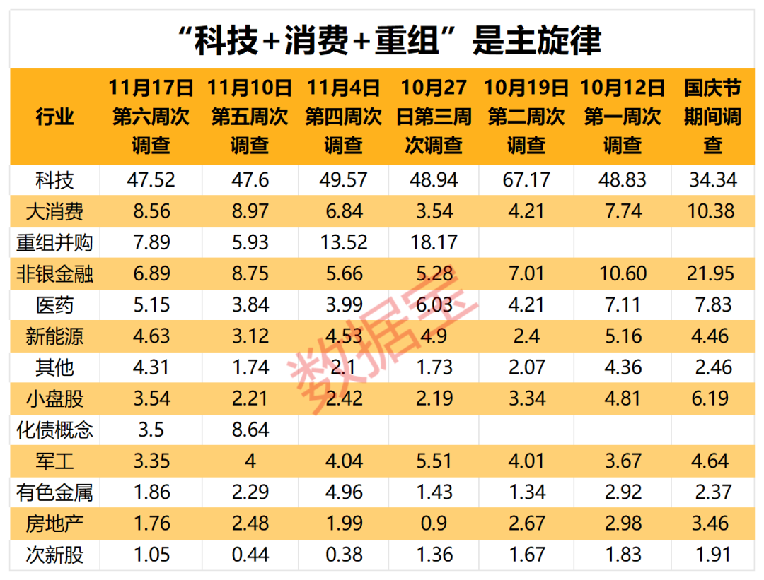 11月16日,数据宝推出了一份《调查,牛市结束了吗?》的小调查。结果显示,大盘经过上周下跌后,投资者情绪有所回落,仅29%的受访者表示本周将上涨。同时,持有继续区间震荡观点的人数保持在38%以上,显示出投资者对市场的谨慎态度。在仓位变化上,也反映出投资者的谨慎心理,上周加仓的比例在减少,减仓的比例在增加。