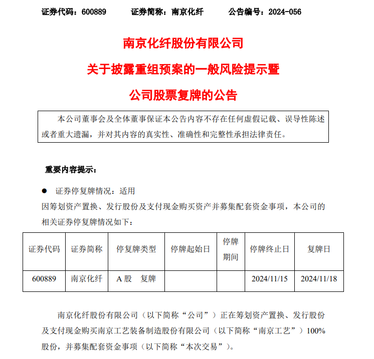 南京化纤(600889)于11月15日晚间发布公告,计划通过资产置换、发行股份及支付现金的方式,全面收购南京工艺100%股份,并拟向特定投资者发行股份募集配套资金。由于标的资产的审计、评估工作尚未完成,目前具体的资产评估值及交易价格尚未确定。公司股票将于2024年11月18日(星期一)恢复交易。