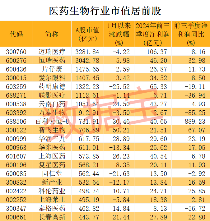 A股市场上,医药生物行业股票数量庞大,市值合计近6万亿元,其中7家公司市值超千亿元。然而,受多重因素影响,医药生物板块今年市场表现低迷,医药生物指数年内累计下跌9.76%。