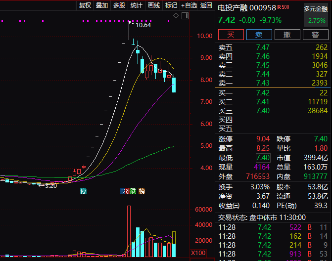 此前连续涨停的电投产融,今日上午也再度跳水,股价逼近跌停。