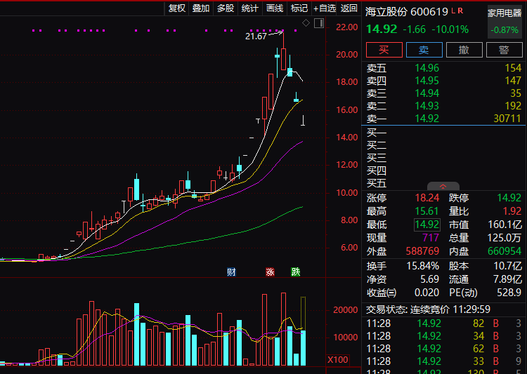 此外,连续大涨后的海立股份,今日上午也再度跌停,这已经是其连续第三个跌停板。