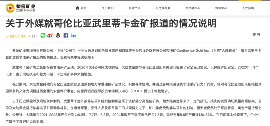 紫金矿业网站发布的声明称,武里蒂卡金矿周边长期存在非法采矿活动。自2020年3月完成收购后,公司与哥伦比亚政府签署了安全保卫协议。然而,自2022年下半年以来,非法采矿事件大幅增加。