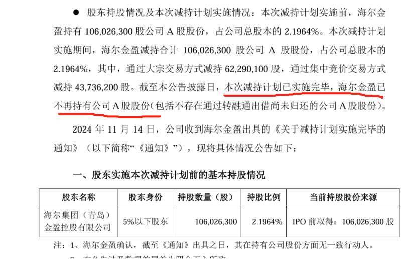 11月14日晚间,中金公司公告称,海尔金盈根据自身发展需要,通过大宗交易或集中竞价交易方式,完成了对中金公司1.06亿股A股股份的减持计划。此次减持后,海尔金盈将不再持有中金公司A股股份。