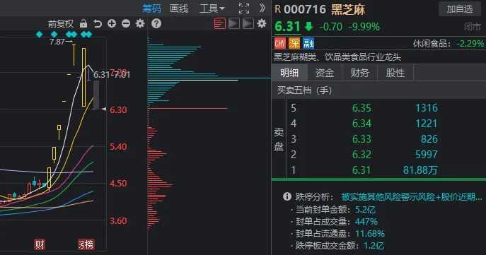 近期,高位人气股黑芝麻在10个交易日内出现涨停或跌停,走势极端。数据显示,目前该股的获利盘约占31.17%,套牢盘则占到近七成。而知名游资佛山系在某日“地天板”后次日出现在卖一位置,疑似“割肉”出逃。此外,黑芝麻还面临一起6553万元的股权质押担保赔偿纠纷,控股股东尚未支付履约保证金。