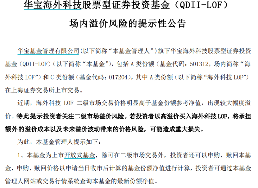 美国大选结果尘埃落定后,QDII基金市场再现溢价现象。11月14日,华宝基金发布公告称,其旗下的海外科技LOF(QDII-LOF)近期在二级市场的交易价格明显高于基金份额参考净值,出现了显著的溢价,并提醒投资者关注这一溢价风险。