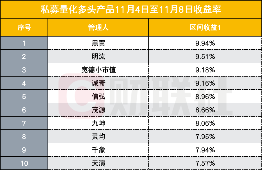 根据第三方平台数据显示,上周,包括黑翼、明汯、宽德、诚奇、信弘、茂源、九坤等在内的多家百亿量化私募,其量化多头策略基金的收益均超过了8%。这一亮眼表现引发了市场的广泛关注。