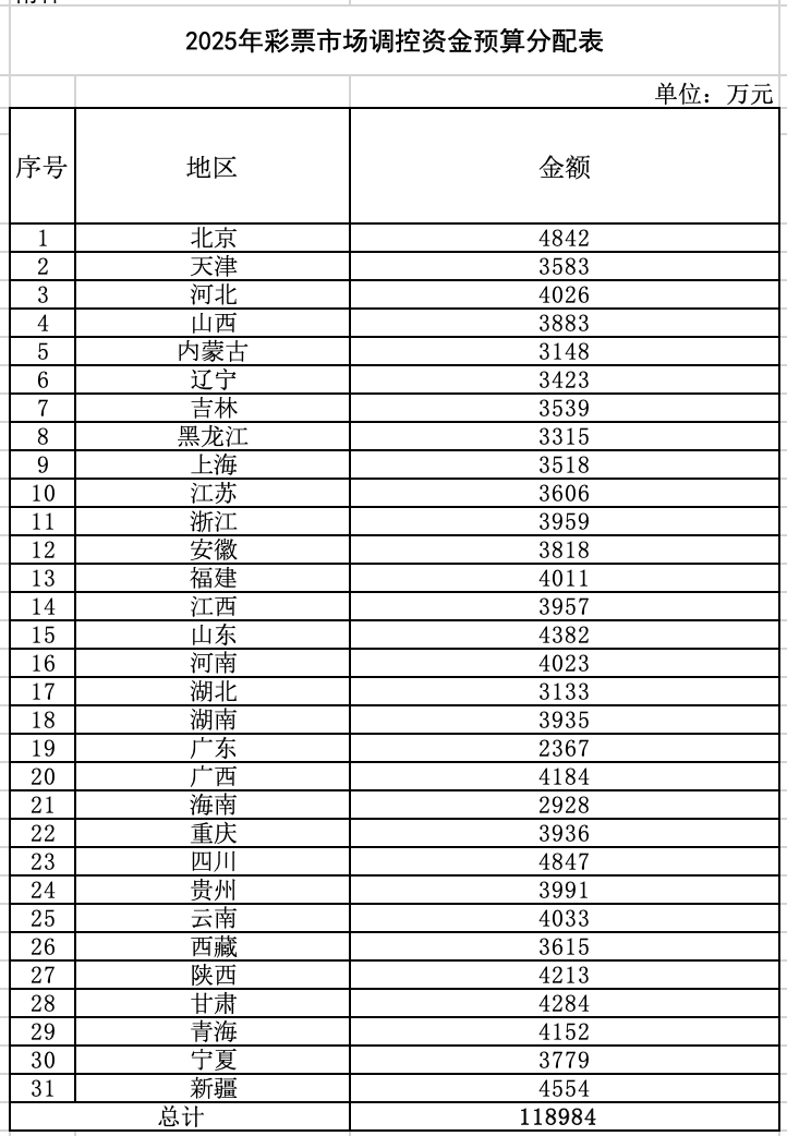 依据资金预算分配明细,各地区所获资金分配详情公布如下:北京市获得4842万元,天津市分得3583万元,河北省收获4026万元,四川省则得到4847万元,新疆维吾尔自治区分得4554万元,河南省获得4023万元。这批资金将用于支持各地区彩票市场的规范化管理和创新发展。