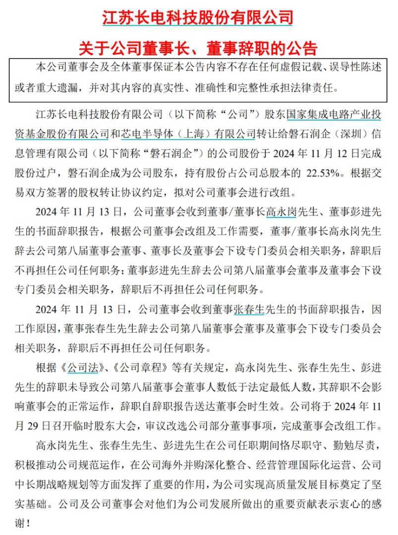 在股份转让顺利完成过户的关键节点,芯片封测业的领军企业长电科技迎来了高层变动。11月13日,长电科技董事长高永岗先生以及另外两位董事彭进先生和张春生先生,向公司董事会提交了书面辞职报告,辞去其在公司的一切职务,标志着公司高层重组的序幕正式拉开。