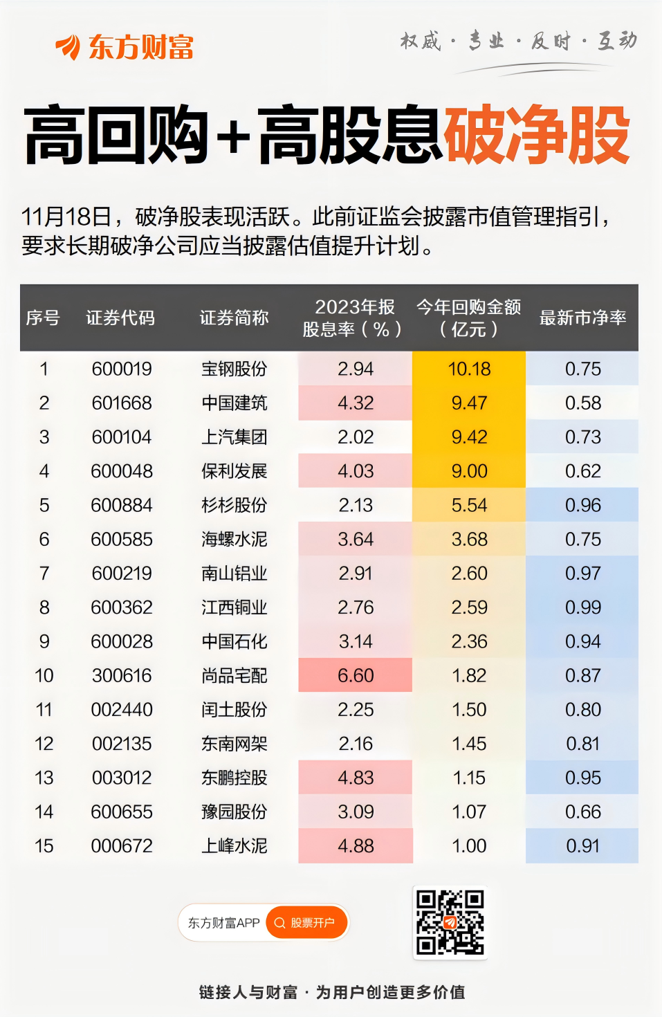 11月18日,破净股表现活跃。证监会发布的市值管理指引要求长期破净公司披露估值提升计划。业内人士认为此举有望提振市场信心,提升股价和股东回报水平。东方财富证券提出相关公司应灵活运用资本市场“工具箱”实现价值最大化。
