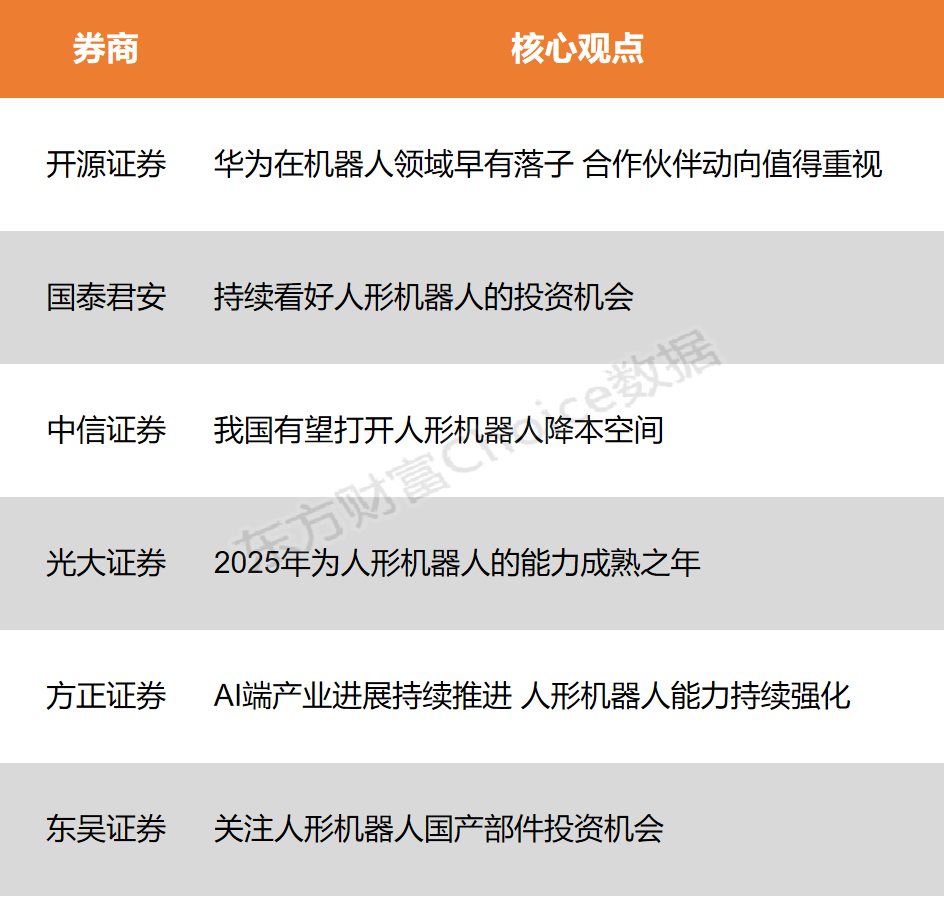 多家券商对华为在机器人领域的布局表示了关注。开源证券指出,华为具备与特斯拉类似的同等能力,且在机器人领域早有布局,其合作伙伴的动向值得重视。国泰君安则持续看好人形机器人的投资机会,认为中国具备全球领先的人形机器人基础,未来有望充分享受人形机器人产业发展带来的产业红利。