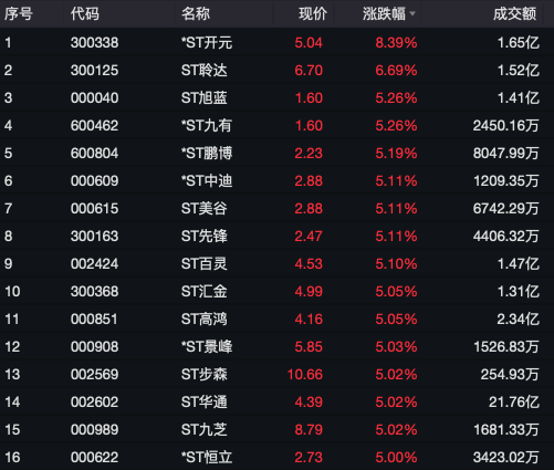 盘面上,大金融、钛金属、云游戏、煤炭等板块表现抢眼,涨幅居前;而次新股、国防军工、锂矿、光刻机等板块则表现不佳,跌幅居前。其中,ST股板块强势拉升,*ST开元涨近9%,ST聆达、ST汇金涨超5%,*ST九有、*ST鹏博、*ST景峰、ST步森、ST九芝等约20只股票涨停,尤其值得关注的是,*ST鹏博已连续8个交易日涨停。