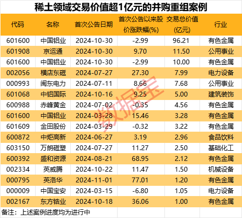 中国铝业作为中国稀有稀土股份有限公司的大股东,近日公告拟通过协议方式受让全资子公司持有的两家公司100%股权,交易对价约为96.21亿元。京运通则计划以11.5亿元对乐山半导体进行增资。此外,还有多家公司的交易价值超1亿元,且并购重组正在进行中。