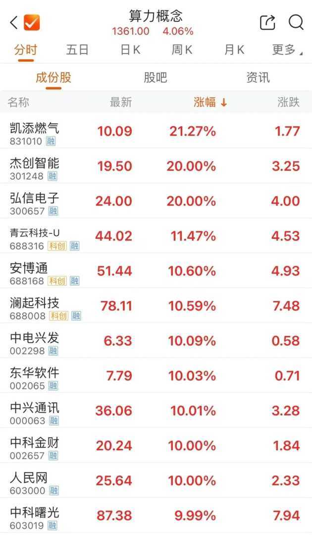 午后,算力概念股持续走高,中科曙光涨停,股价创下历史新高。同时,中兴通讯、人民网等个股也纷纷涨停,算力板块的强势表现引人注目。