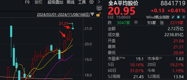 同样的情况也发生在全A平均股价上,该指标今日收涨0.61%,不受个股加权影响,可视为全体A股的表现。今日领跌的除了券商,还有银行、地产以及白酒等权重板块。