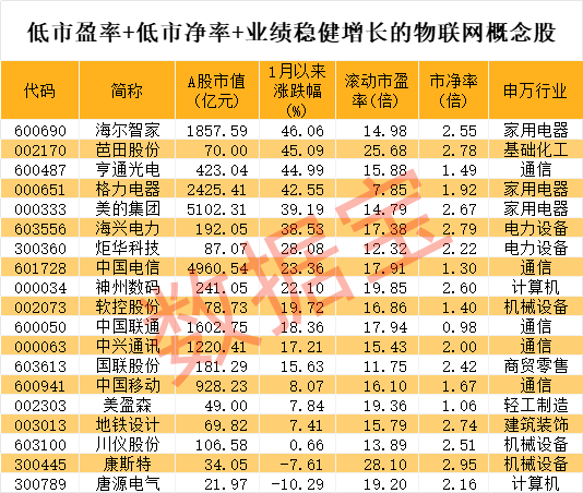 滚动市盈率低于30倍且市净率(PB)低于3倍的概念股共有19只,其中6只市值超过千亿,分别是美的集团、中国电信、格力电器、海尔智家、中国联通、中兴通讯。今年以来,这19只股票平均上涨了21.42%,远超同期上证指数。其中,海尔智家、芭田股份、亨通光电、格力电器累计涨幅更是超过了40%。