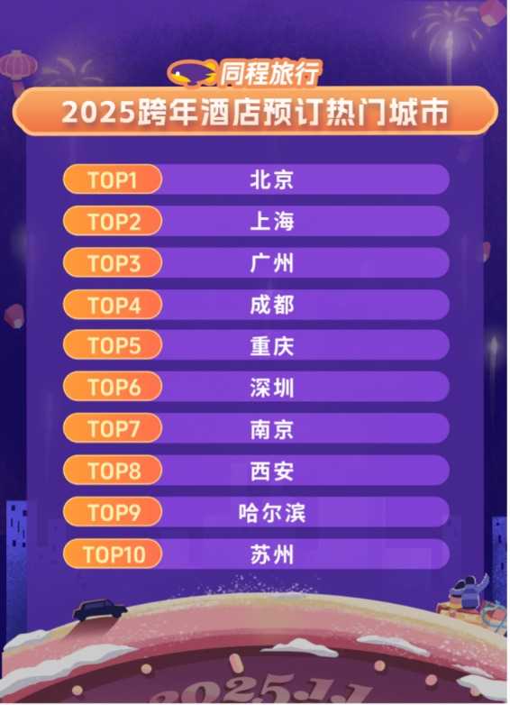 从具体数据来看,跨年的仪式感成为了最近两天的热门话题。同程旅行数据显示,北京成为2025年跨年酒店预订最热门的城市,上海、广州、成都、重庆、深圳、南京、西安、哈尔滨、苏州也位列榜单前十。同时,一批小众旅游目的地也受到了更多关注,如海南琼中、黑龙江伊春、辽宁辽阳、新疆克拉玛依等城市的酒店预订热度同比增长超过40%。