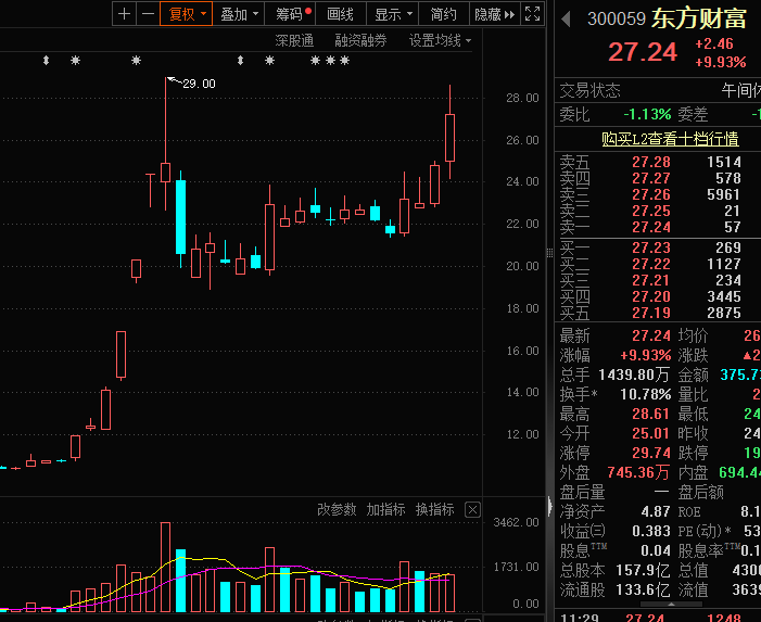 除军工板块表现亮眼外,华为算力、数字货币、互联金融、工业软件、MCU芯片、信创等题材亦呈现大幅上涨态势。早盘A股市场成交活跃,合计成交额达到1.43万亿元。互联金融概念龙头东方财富成交额高达375.7亿元,位居早盘成交榜首位,盘中一度涨幅超过15%,午间收盘时涨幅收窄至9.93%。此外,赛力斯、常山北明、欧菲光、中国长城、通富微电等个股成交额亦突破百亿元。