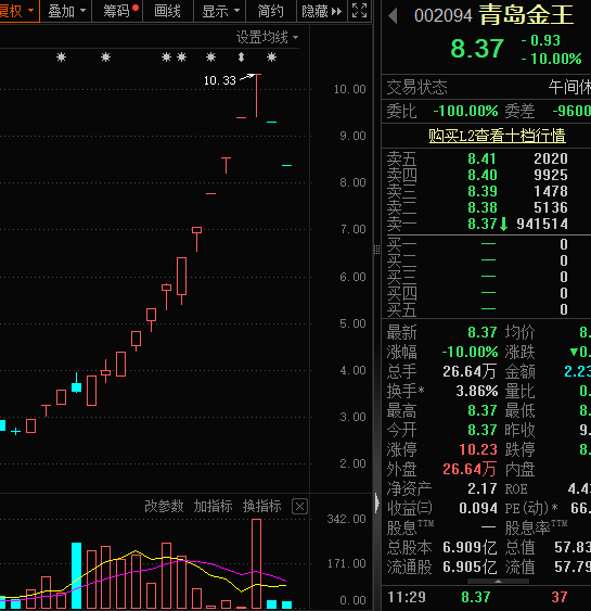 然而,蜡烛龙头常山北明则出现高位跳水。尽管早盘一度上涨近5%,但截至午间收盘时,股价转跌1.09%。四川长虹、海能达、电广传媒、电投产融、青岛金王等个股亦出现下跌。其中,青岛金王早盘直接一字跌停,跌停板封单一度超过百万手。此前,该公司在17个交易日内斩获13个涨停板,但近日连续跌停。