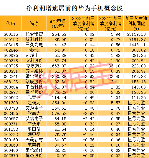 受益于消费电子行业的复苏,华为手机产业链上的概念股整体业绩呈现增长态势。截至11月4日收盘,涉及华为手机产业链的概念股A股市值合计超过2万亿元。今年前三季度,这些概念股合计实现盈利332.44亿元,同比增长84.93%。其中,44只概念股净利润增速超过30%,包括江波龙、艾为电子、欧菲光、弘信电子、菲沃泰等。欧菲光前三季度实现净利润0.47亿元,成功扭亏为盈。