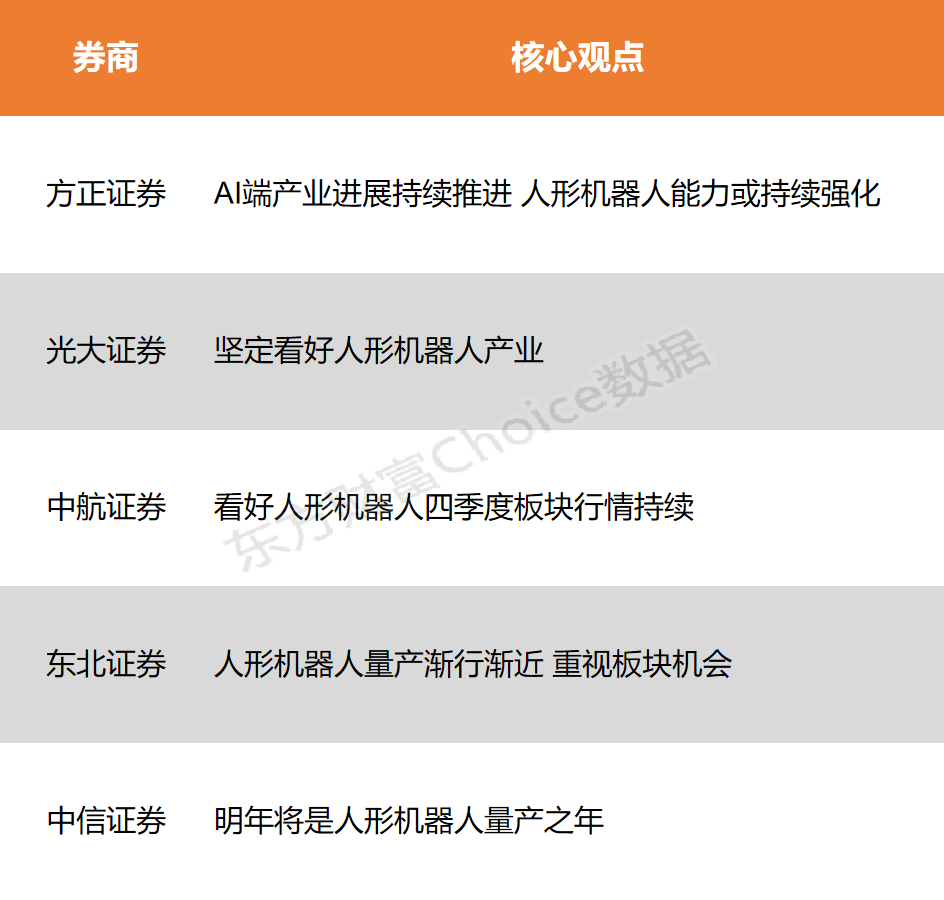多家证券机构对人形机器人产业表示看好。方正证券指出,AI端产业进展持续推进,人形机器人在视觉、语音、运动控制等方面的能力或持续强化。光大证券则认为,2025年将是人形机器人的能力成熟之年,并坚定看好人形机器人产业的发展前景。中航证券同样看好人形机器人产业,认为四季度板块行情有望持续。东北证券则表示,人形机器人量产渐行渐近,投资者应重视板块机会。而中信证券则预测,明年将是人形机器人的量产之年,建议关注特斯拉机器人产业链核心标的。