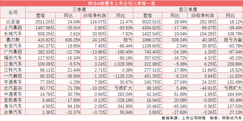 截至10月31日,财联社记者统计的16家A股上市车企三季度业绩显示,比亚迪、赛力斯、中通客车和海马汽车实现了营收和利润的双增长,而7家车企则出现双降,占比超过四成。尤为值得注意的是,除比亚迪外,其他10家车企三季度归母净利合计84.5亿元,仅占比亚迪当季116.07亿元的73%。